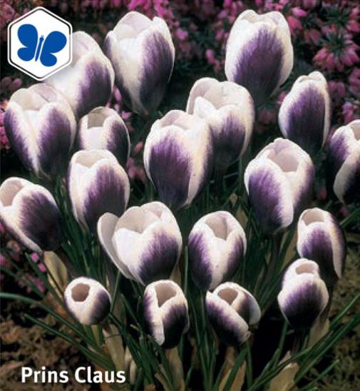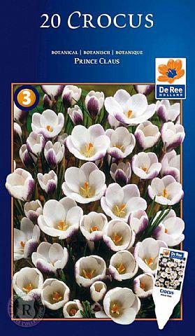 20 stk./pose. Crocus Prince Claus hører til gruppen af botaniske krokus. Farve: Mørkelilla i bunden, hvid top. Højde: 10 cm. Blomstring: Februar-marts. Plantetid: Fra september til frosten går i jorden. Placering: Halvskygge. Planteafstand: 5 cm. Plantedybde: 5 cm. Attraktiv for bier og sommerfugle.